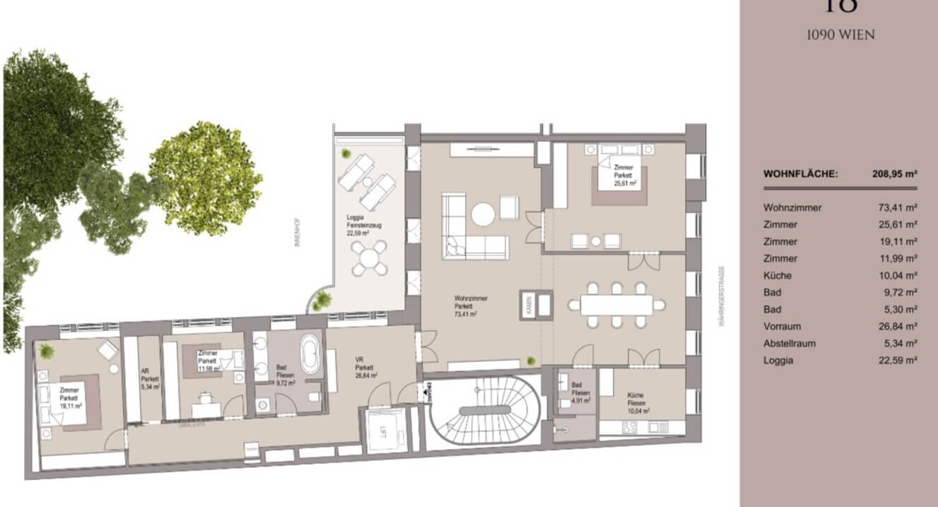 Besonders hervorzuheben ist der begrünte Innenhof mit Brunnen, sowie die idyllische Loggia mit Blick ins Grüne – ein echtes Altbaujuwel mitten in Wien.